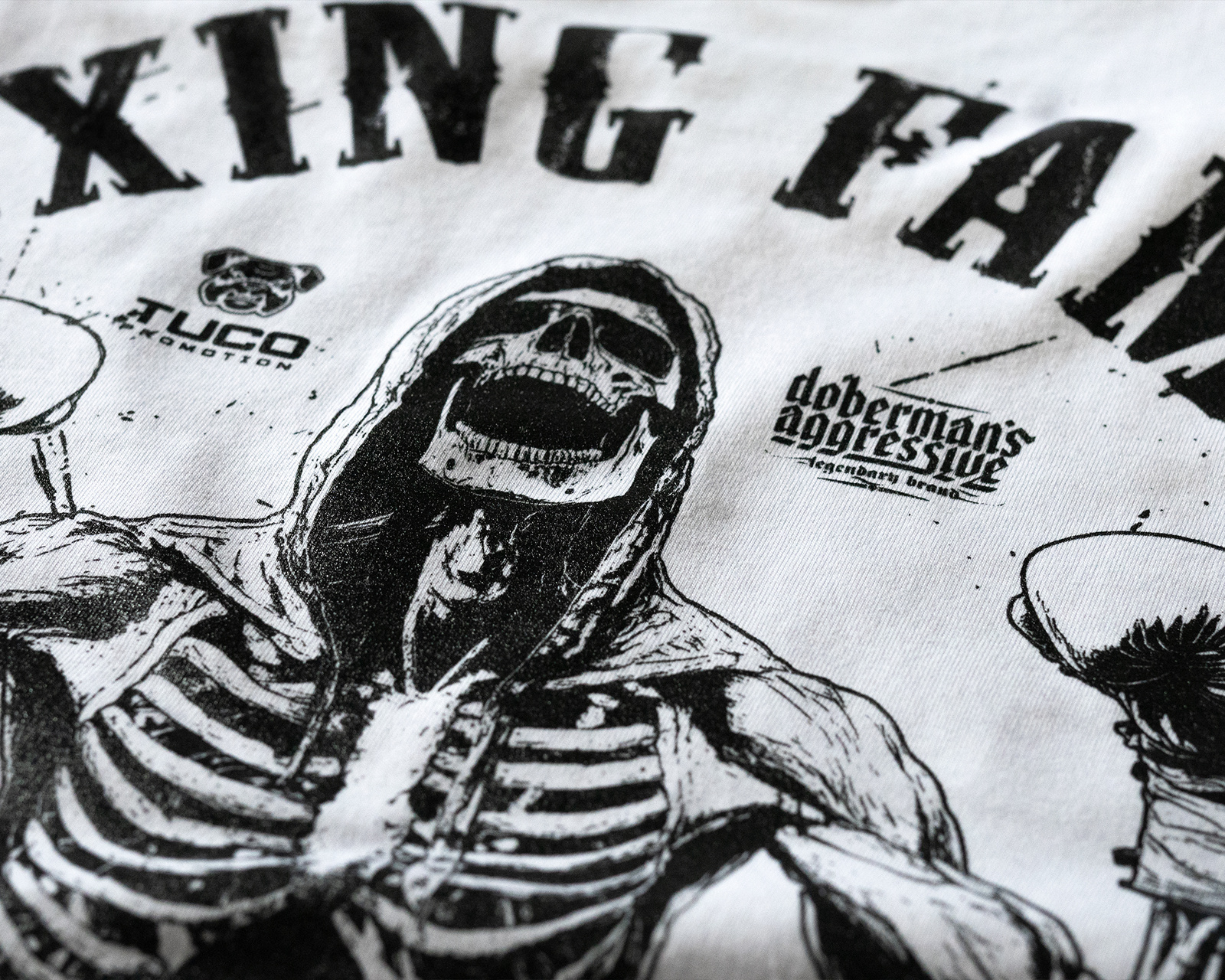 Model ozdobiony dużym nadrukiem na plecach, przedstawiającym szkielety bokserów w ringu. Nad grafiką umieszczona jest nazwa serii "Boxing Family", a poniżej napis "Ultimate Fight Doberman's". Na przodzie, na lewej piersi, znajduje się małe logo z motywem bokserskim. Bluza wykonana z wysokiej jakości materiału, posiada elastyczne ściągacze przy rękawach i u dołu, co zapewnia wygodne dopasowanie.