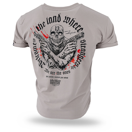 Odzież wykonana z bawełny o gramaturze 200g. Na lewym rękawku mała metka z logo Doberman’s Aggressive. Na plecach duży nadruk przedstawiający postać z głową czaszki trzymająca dwa pistolety. Dodatkowo napis „Welcome to the land where strangers die”. Na piersi podobna grafika w mniejszym rozmiarze.