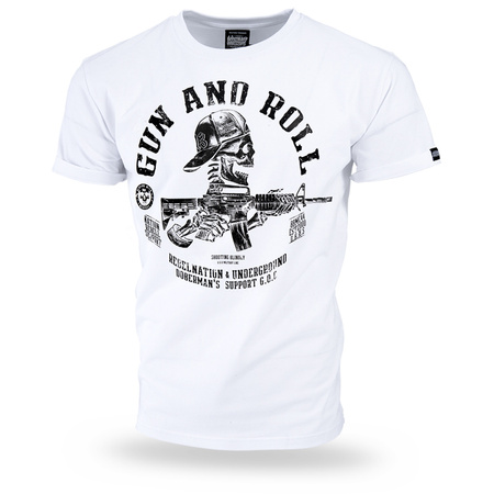 Na lewym rękawku wszyta mała metka z logo marki. Na przodzie grafika czaszki w czapce z daszkiem z karabinem M4 i napisem GUN AND ROLL. Z tyłu na karku miniaturka grafiki oraz logo Doberman’s Aggressive.