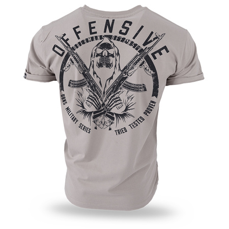 Przy szyi została wykończona praktycznym ściągaczem. Na lewym rękawku koszulki znajduje się mała metka z logo Dobermans Aggressive. Z tyłu nadrukowany został wzór z linii Offensive - zakapturzona postać z dwoma karabinami. Całość wzoru zamknięta została napisem Offensive. Na przodzie mały nadruk na piersi nawiązujący do stylu militarnego.