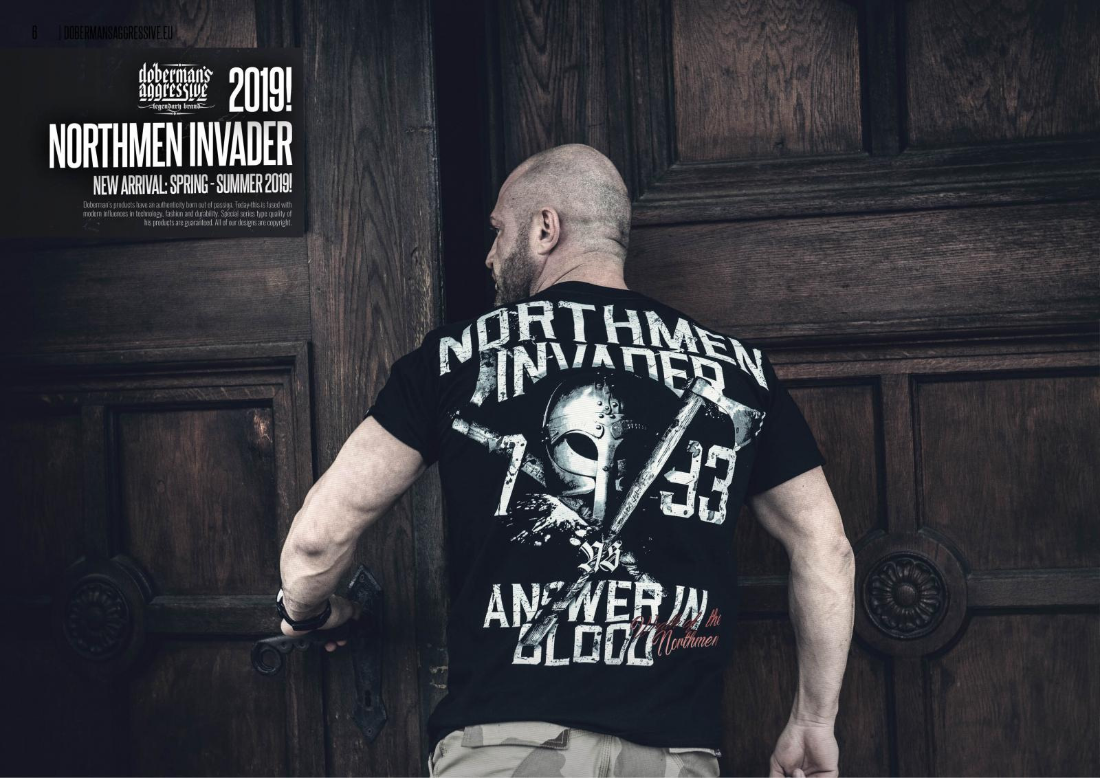 Na dole wszyta mała metka z logo marki Dobermans Aggressive, przy karczku większa wszywka. Przy lewym barku nadrukowano runiczny napis. Na plecach nadruk zajmujący niemal całą powierzchnię koszulki. Wzór przedstawia hełm wikinga oraz dwa skrzyżowane topory. Powyżej napis Northmen Invader, poniżej slogan Answer in Blood. Wzór inspirowany wydarzeniami historycznymi.