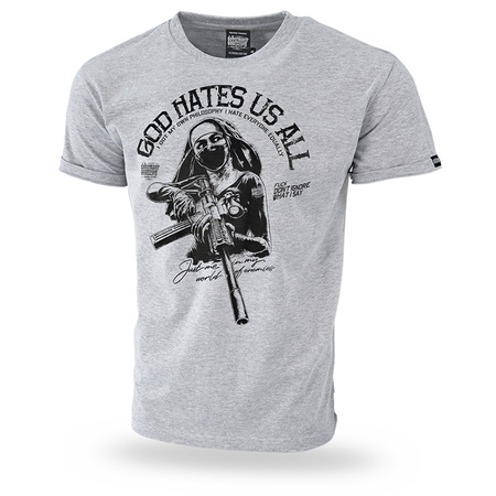 Wykonana z najwyższej jakości bawełny. Model The Nun stworzony dla wybranych. Koszulka z dużym nadrukiem postaci zakonnicy z bronią oraz napisem GOD HATES US ALL i logo marki Doberman’s Aggressive.