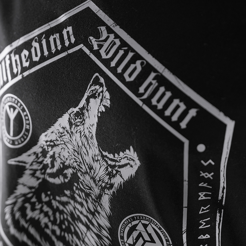 Na lewym rękawku mała metka z logo Dobermans Aggressive. Centralnie na piersi umieściliśmy groźnego wilka z otwartą paszczą, otoczonego symbolami runicznymi. Całość zamknięta jest w sześciokącie. Dookoła napisy wykonane gotycką czcionką oraz symbole pochodzące z alfabetu runicznego, nadające charakteru całej grafice. Na karku mały symbol runiczny Valknut.