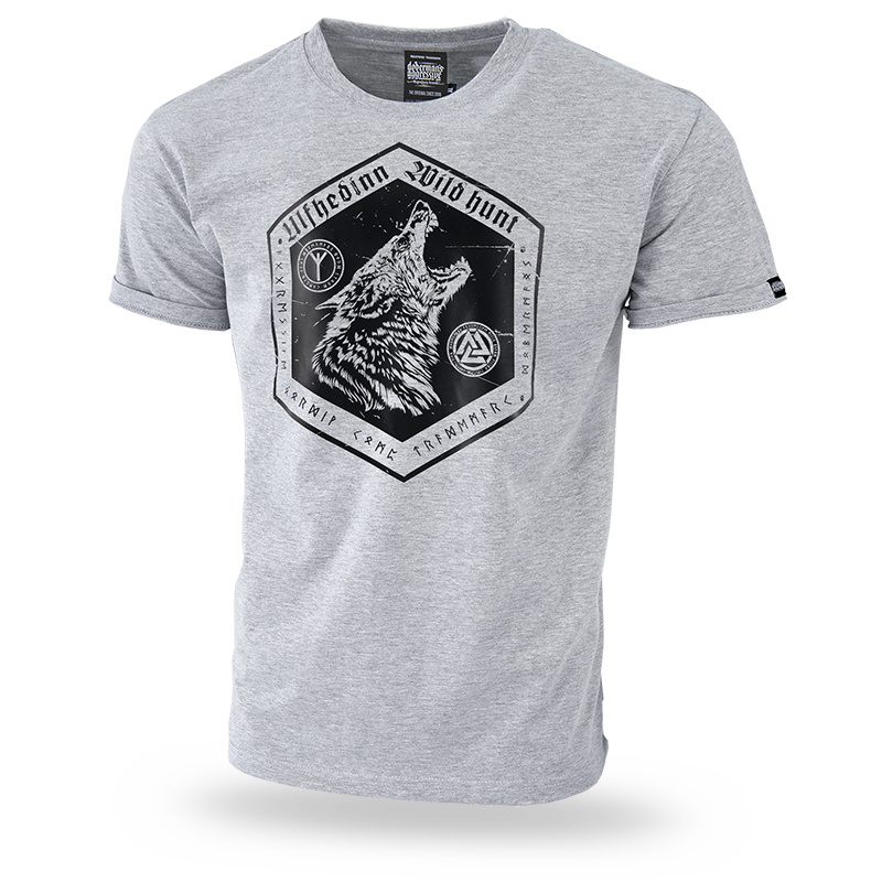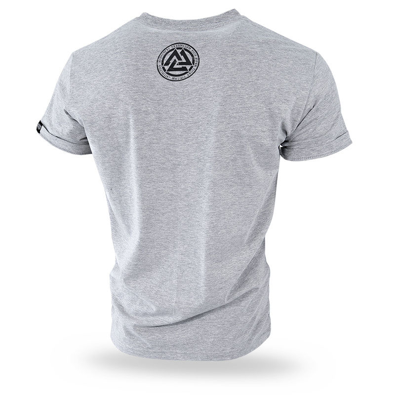 Na lewym rękawku mała metka z logo Dobermans Aggressive. Centralnie na piersi umieściliśmy groźnego wilka z otwartą paszczą, otoczonego symbolami runicznymi. Całość zamknięta jest w sześciokącie. Dookoła napisy wykonane gotycką czcionką oraz symbole pochodzące z alfabetu runicznego, nadające charakteru całej grafice. Na karku mały symbol runiczny Valknut.