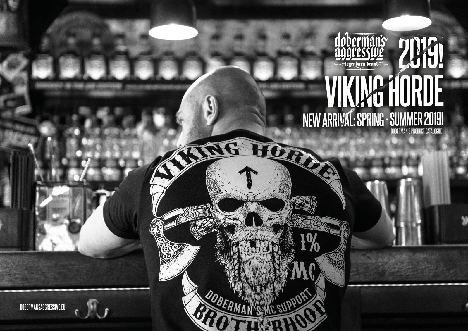 Wąski ściączacz przy szyi poprawia komfort noszenia. Na lewym rękawku tkana metka z logo Dobermans Aggressive. Plecy koszulki zostały ozdobione dużym nadrukiem z czaszką wikinga. Za nią znajdują się dwa topory. Na banerach napisy - Viking Horde oraz Brotherhood. Na lewej piersi trzy mniejsze czaszki z runicznymi symbolami. Całość nawiązuje do nordyckiej mitologii. Nadruk w jednym kolorze.