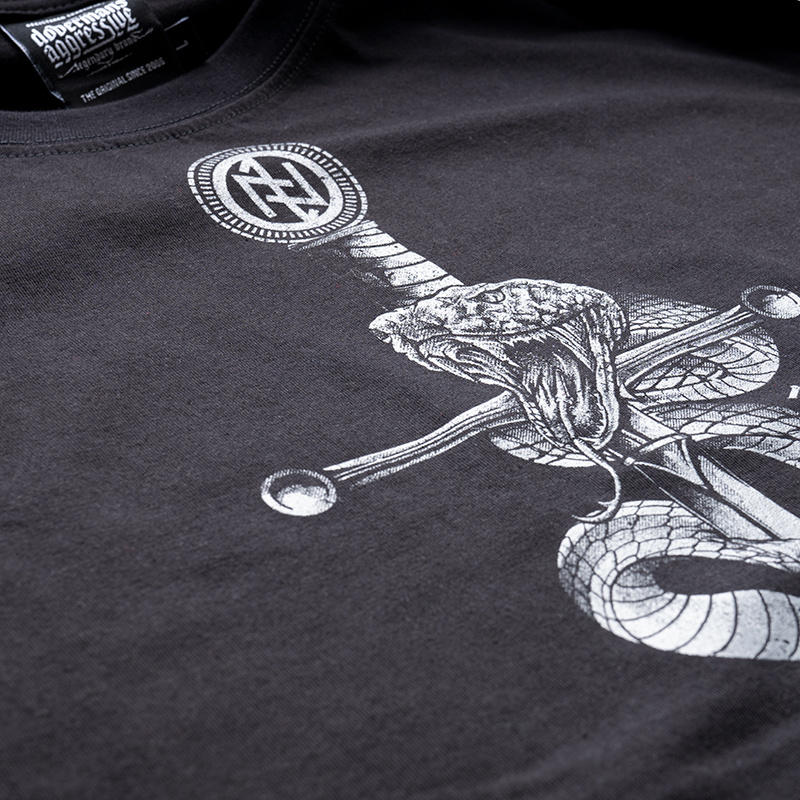 Wykonana z bawełny o wysokiej gramaturze. Na lewym rękawie wszyta mała metka z logo marki. Na przodzie koszulki znajduje się postać węża oplatającego miecz. Grafikę uzupełnia dopisek The Serpent’s Trail.