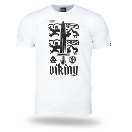 Koszulka wykonana z wysokiej jakości bawełny, zapewniającej komfort noszenia. Na froncie znajduje się duży nadruk przedstawiający skandynawski miecz na tle heraldycznych lwów, a także nordyckie symbole oraz napis "Viking" w stylizowanej czcionce.