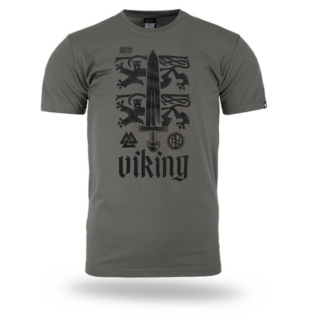 Koszulka wykonana z wysokiej jakości bawełny, zapewniającej komfort noszenia. Na froncie znajduje się duży nadruk przedstawiający skandynawski miecz na tle heraldycznych lwów, a także nordyckie symbole oraz napis "Viking" w stylizowanej czcionce.